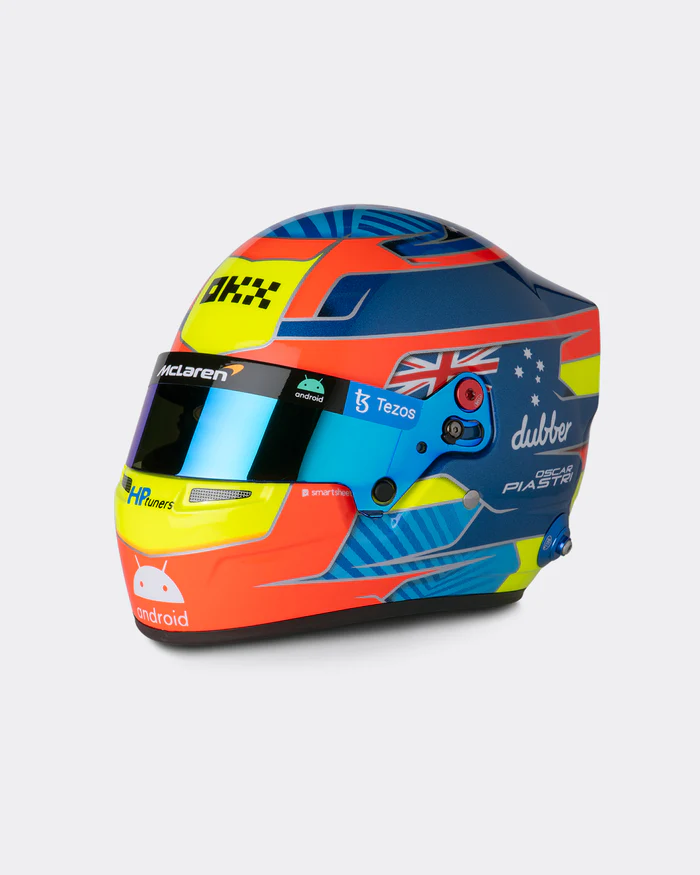 Replicating Oscar Piastri’s 2023 striking red, blue and yellow design. These replicas feature his distinctive racing number on top, personal logo on the back and Australian flag on the side. There is high-quality detailing around the HANS device clips, adjustable visor and chin straps.