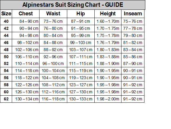 Below is a GUIDEÂ to Alpinestars suit sizing. The dimensions are based on ACTUAL body measurements.