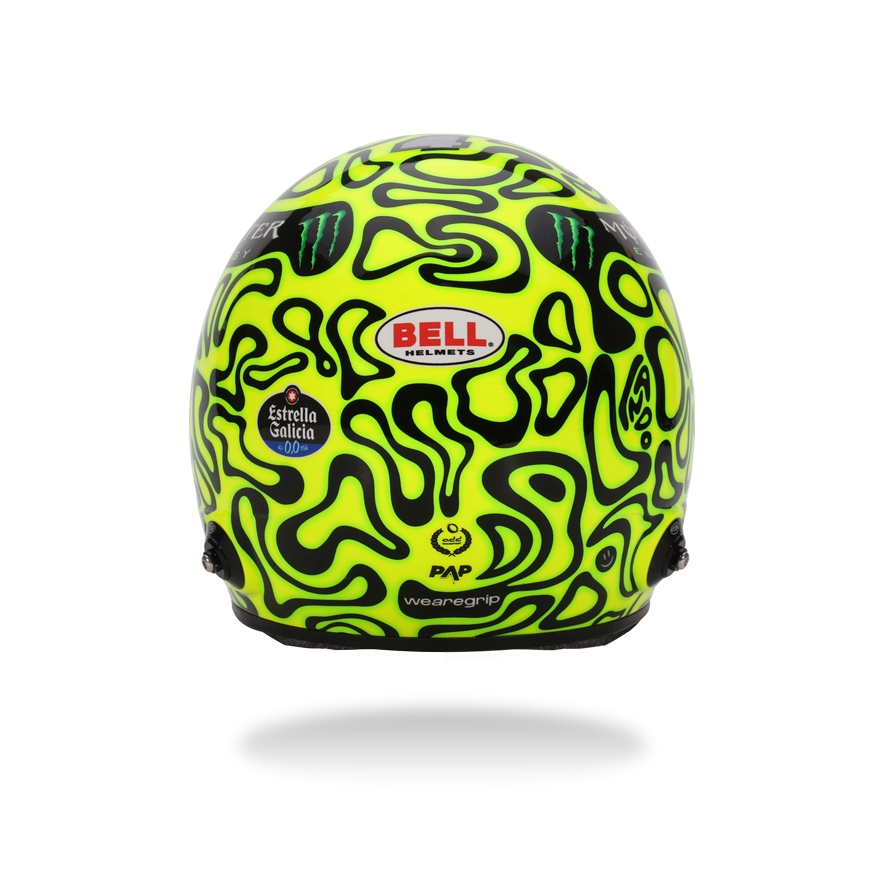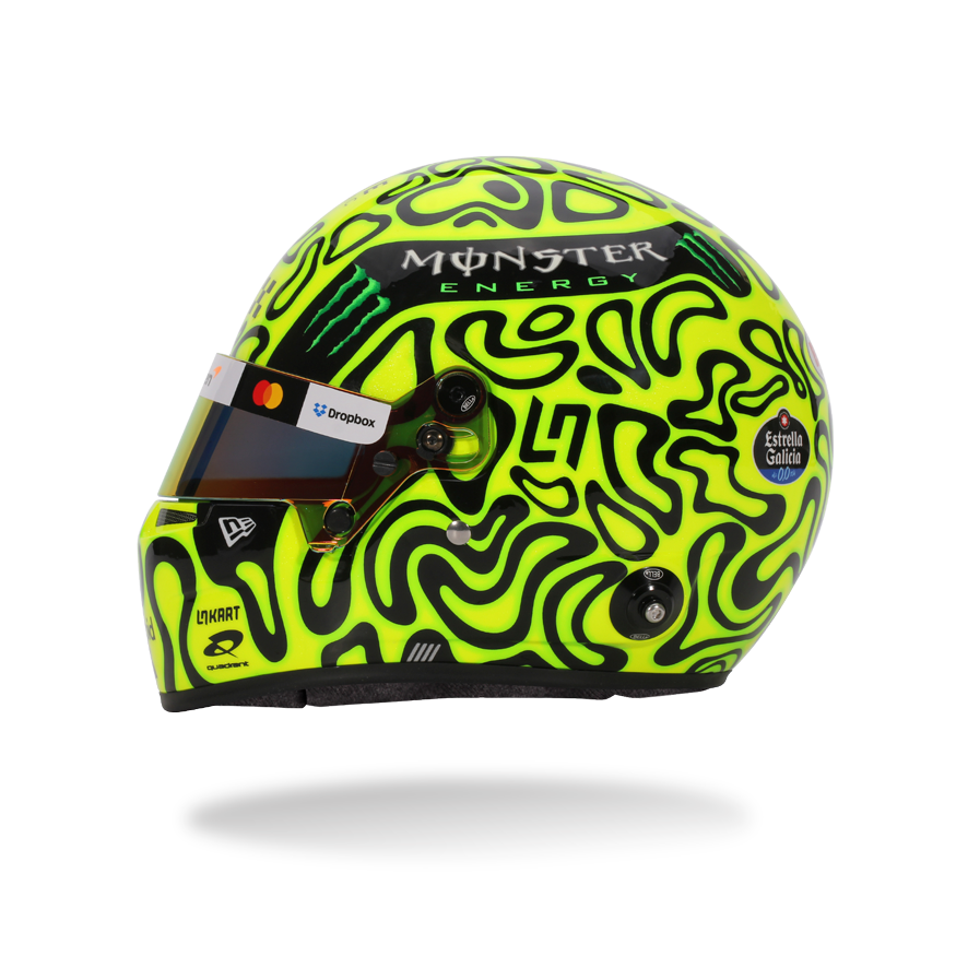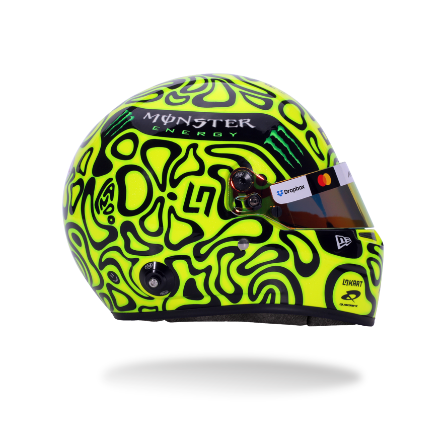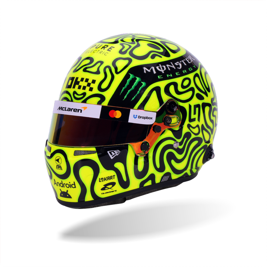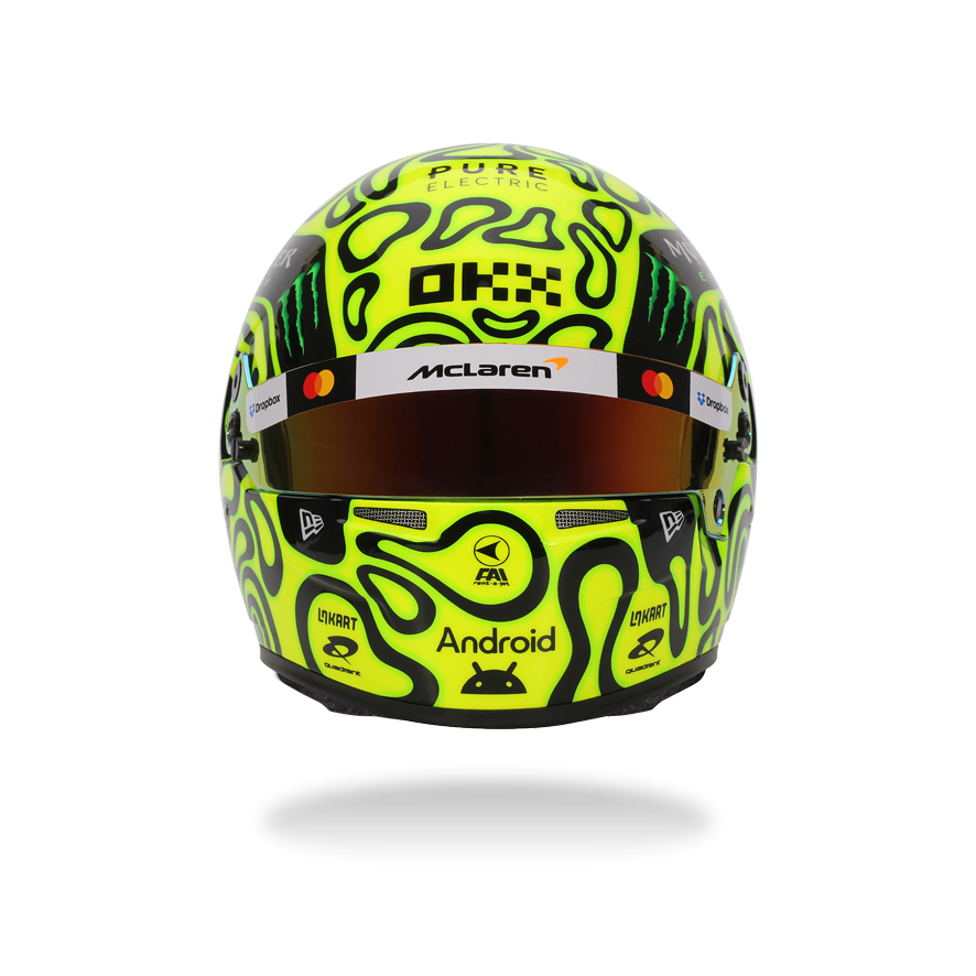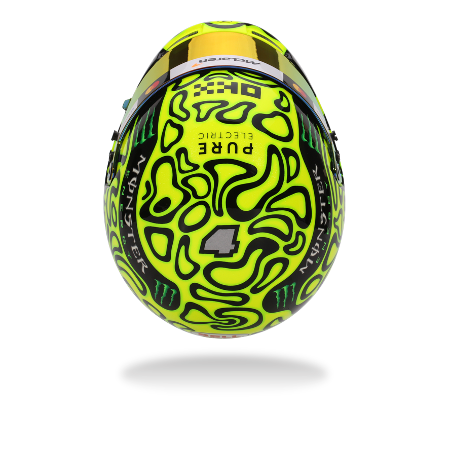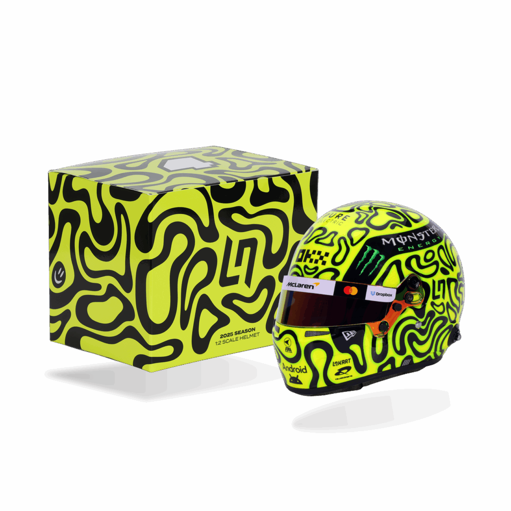1:2 scale mini Lando Norris 2025 McLaren replica mini helmet. These replicas are a must for any Lando Norris fan.